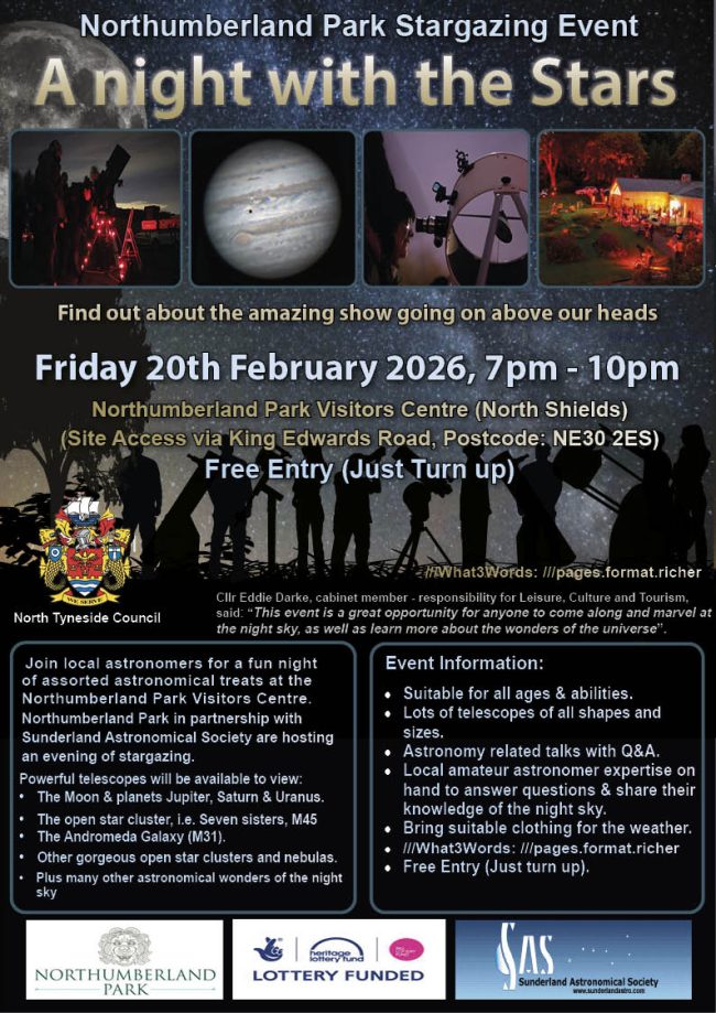 Back by popular demand, Sunderland Astronomical Society are will visiting Northumberland Park). Date: Friday 20th February 2026. Time: from 7:00 pm – 10:00 pm. Entry: Free Event SAS have been asked by the Northumberland Park (the park in North Shields) to hold a Stargazing event on Friday 20th February 2026 from 7 pm till 10 pm.